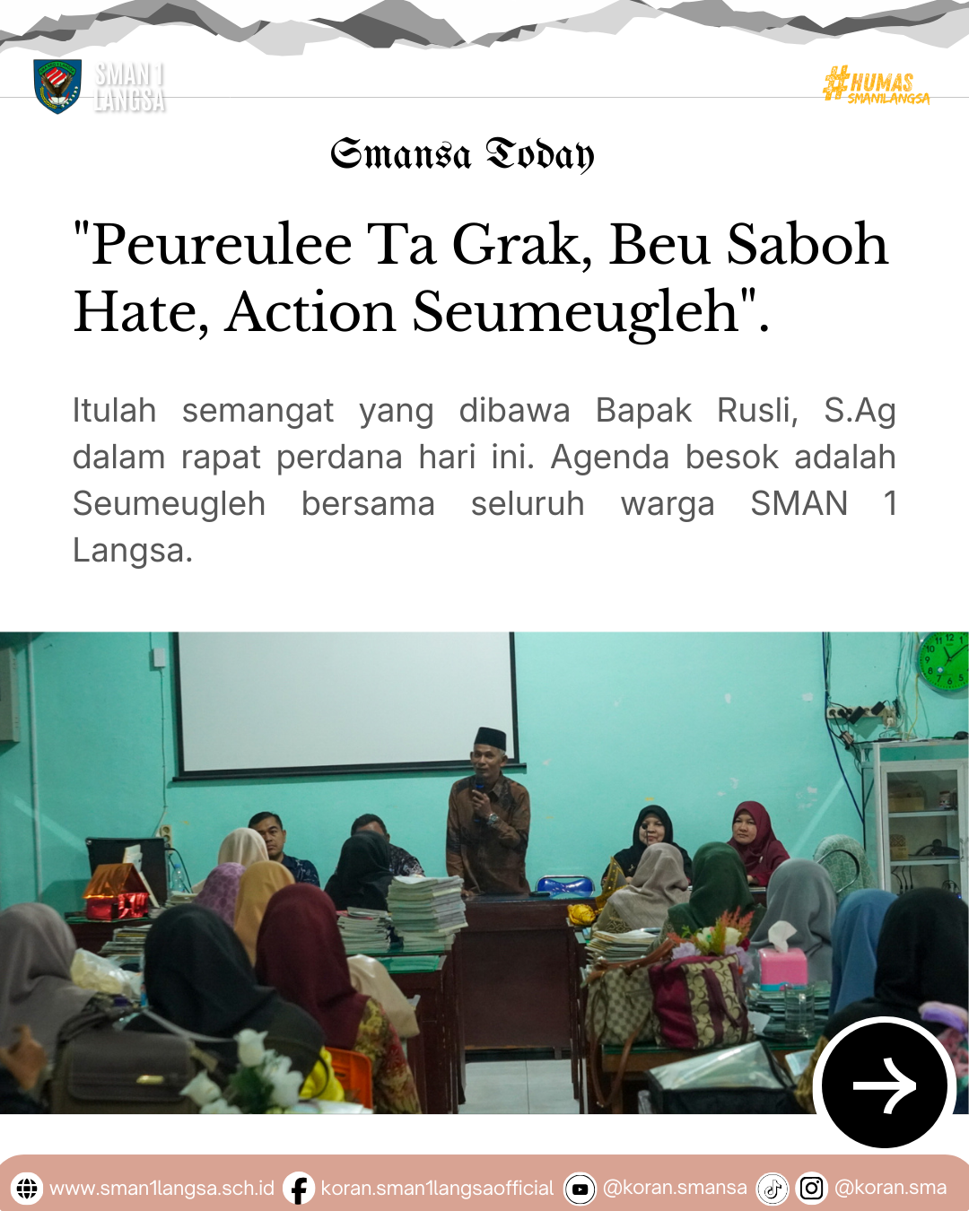 Rapat Perdana Bersama Bapak Rusli, S.Ag: Gelar “Seumeugleh” Esok Hari, Wujud Sinergitas dan Kekompakan SMAN 1 Langsa Langsa – Semangat kebersamaan langsung terasa dalam rapat perdana SMA Negeri 1 Langsa bersama Kepala Sekolah yang baru, Bapak Rusli, S.Ag. Tidak hanya membahas teori pendidikan, Bapak Rusli langsung tancap gas dengan aksi nyata. Agenda utama yang dibahas …