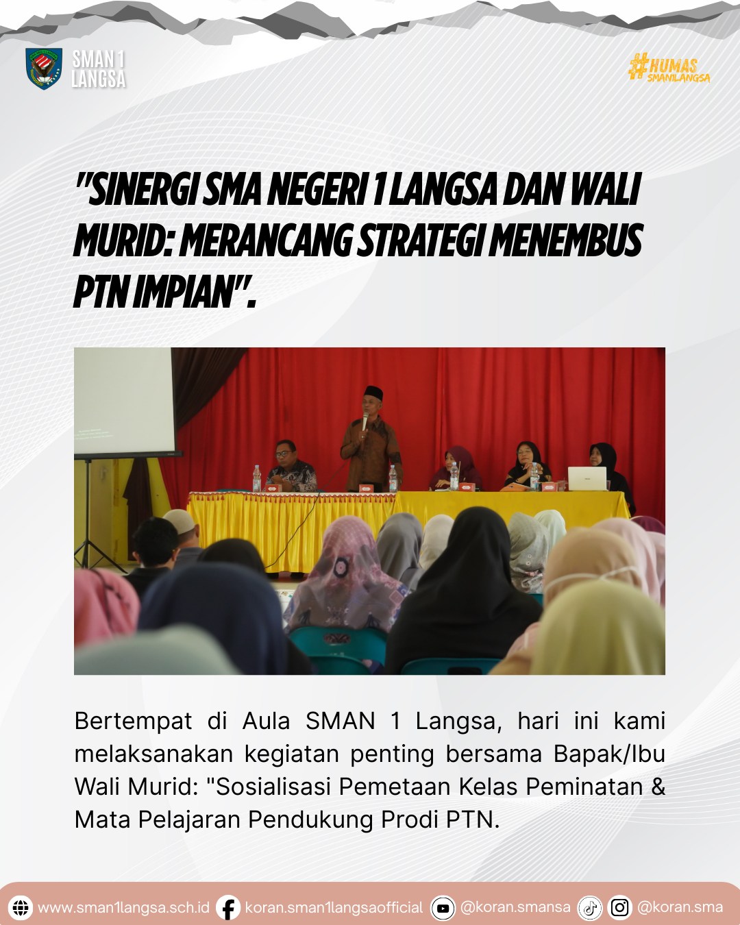 “Sinergi SMA Negeri 1 Langsa dan Wali Murid: Merancang Strategi Menembus PTN Impian”. Bertempat di Aula SMAN 1 Langsa, hari ini kami melaksanakan kegiatan penting bersama Bapak/Ibu Wali Murid: “Sosialisasi Pemetaan Kelas Peminatan Kelas XI & Mata Pelajaran Pendukung Prodi PTN.” Mengapa ini penting? Karena di Kurikulum Merdeka, pemilihan mata pelajaran di Kelas XI adalah …
