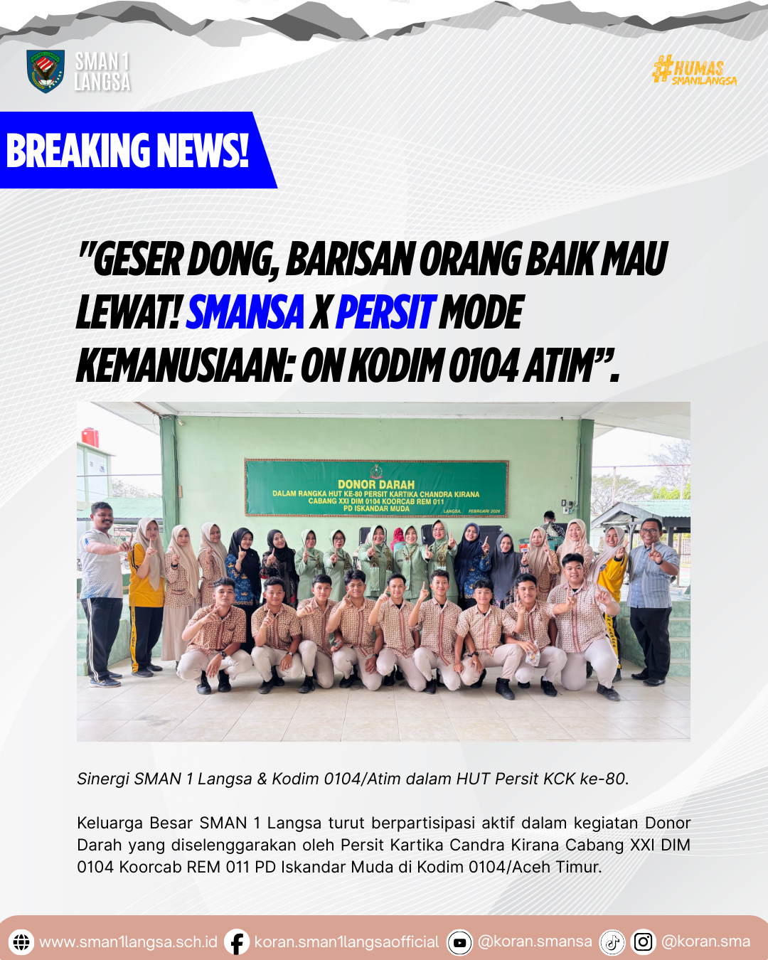Keluarga Besar SMAN 1 Langsa turut berpartisipasi aktif dalam kegiatan Donor Darah yang diselenggarakan oleh Persit Kartika Candra Kirana Cabang XXI DIM 0104 Koorcab REM 011 PD Iskandar Muda di Kodim 0104/Aceh Timur. Semangat berbagi ditunjukkan oleh siswa-siswi kami yang antusias mendonorkan darah demi kemanusiaan. Kegiatan ini didampingi langsung oleh tim solid guru SMANSA: …