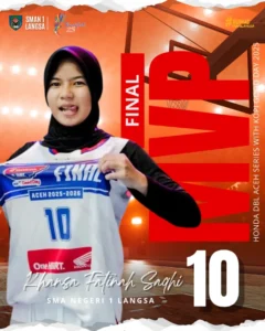 Khansa Fatinah Saqhi #10 terpilih sebagai MVP Final Honda DBL Aceh with Kopi Good Day 2025 setelah menunjukkan permainan luar biasa di ajang Honda DBL Aceh saat bertemu Final melawan SMA Lab School Unsyiah B. Aceh di GOR Unsyiah Banda Aceh.