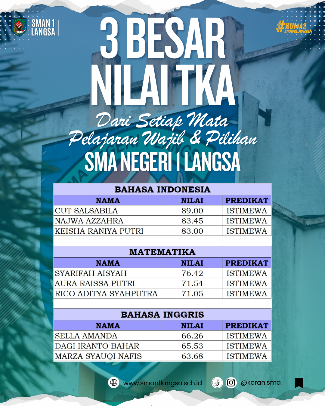 Selamat kepada teman-teman yang berhasil meraih Nilai TKA Tertinggi untuk mata pelajaran Bahasa Indonesia, Matematika, dan Bahasa Inggris. Predikatnya “Istimewa” semua nih, keren banget…